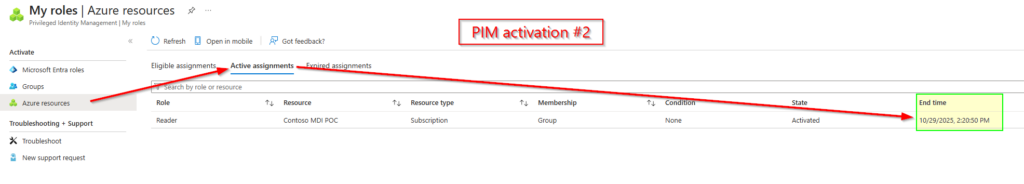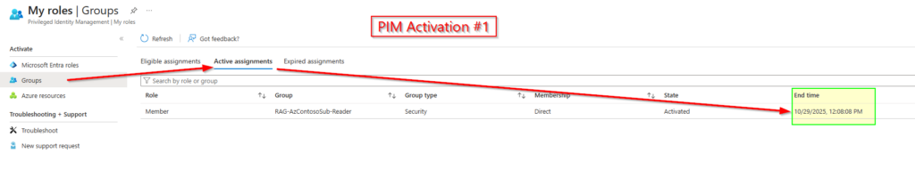 In the screenshot below, you can see PIM Activation #1 has an End time of 12:08:08 PM for the group membership assignment.