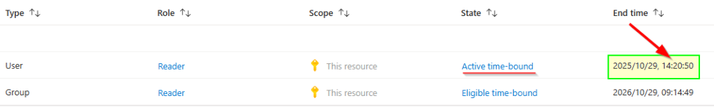 After the group assignment was deactivated, the user is still “Active time-bound” in the reader role until 14:20:50 (Azure IAM displays time differently for some reason), as can be seen below: